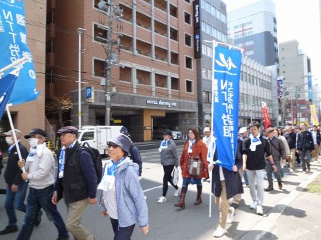 5月1日、暖かな晴天の下、桜が満開の大通公園8丁目広場において 「次代につなぐ 平和の願い! みんなでつくろう 支え合う安心社会と確かな未来を!」をメインスローガンとして第96回全道メーデーが開催され、札幌退職者の会からは14名が参加しました。